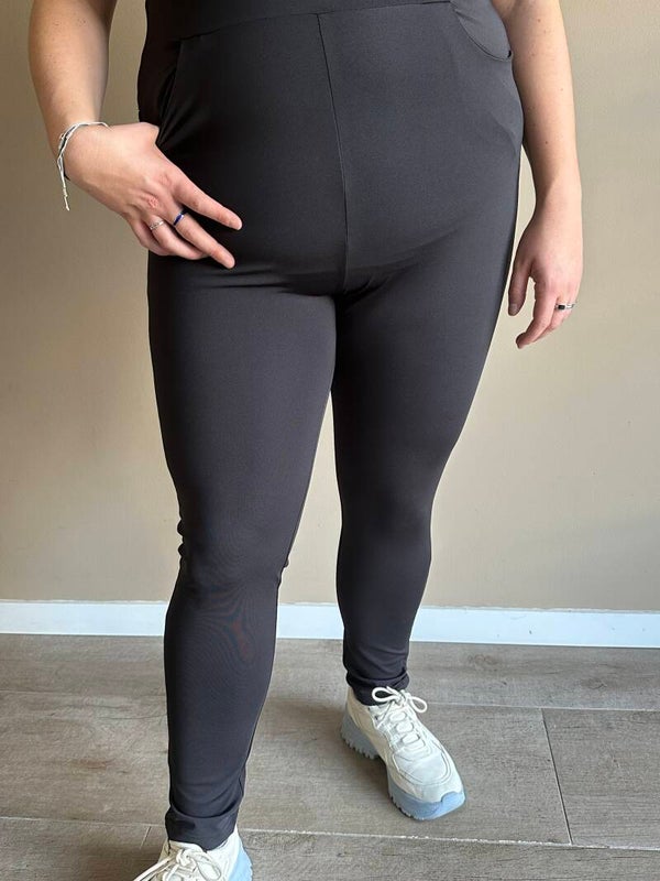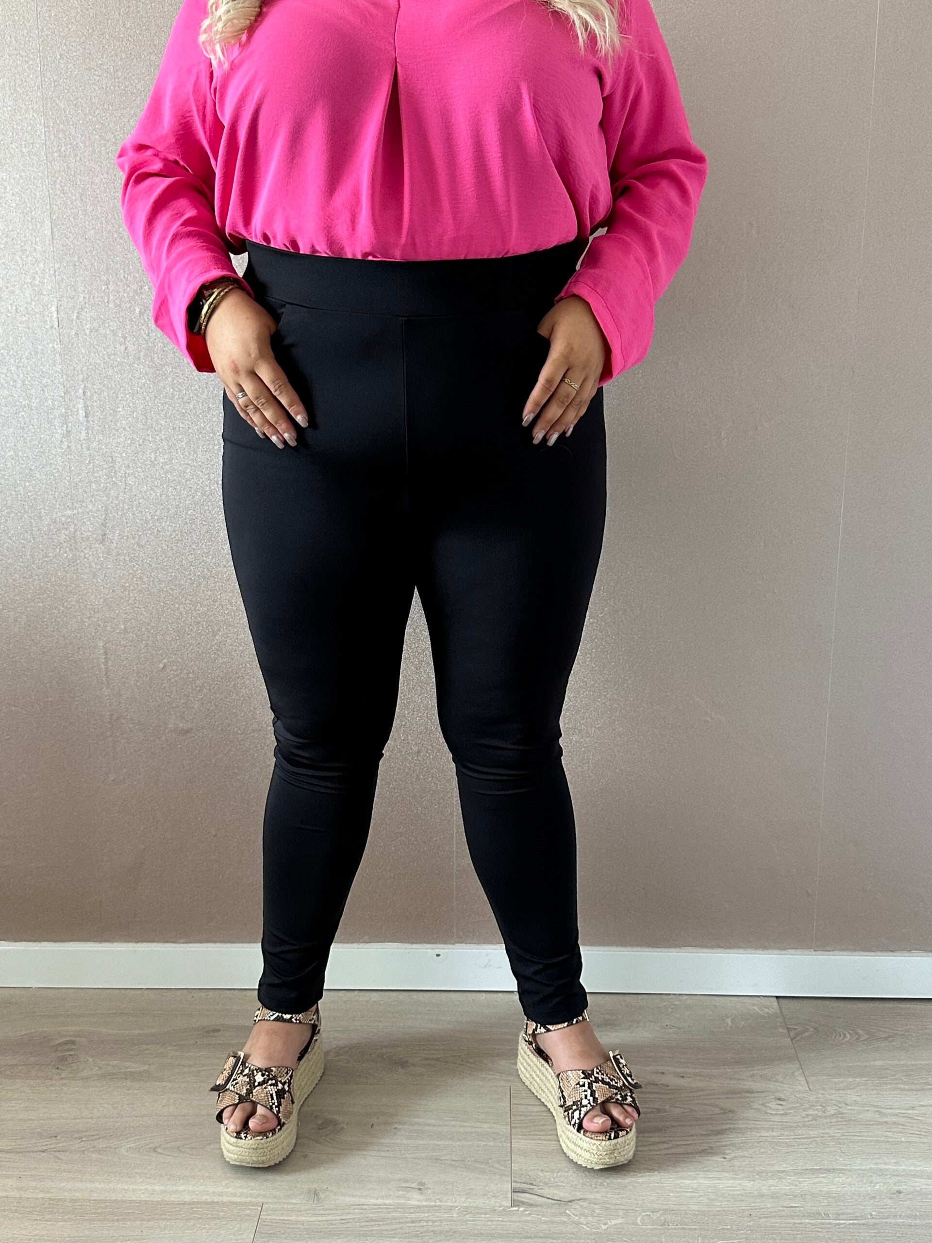 Deze dames legging valt high waisted en 20 cm hoger dan een normale broek. Deze dames legging heeft zakken aan de voorkant en een heerlijke stof. De dames legging is verkrijgbaar in de kleur zwart en heeft een heerlijke stretch, daardoor is de legging ook draagbaar voor dames met een maatje meer. Deze zwarte dames legging hebben we in plussize maten of grote maten. We hebben twee verschillende maten, maat 1 is vaan maat 44 t/m maat 46 en maat 2 is van maat 46 t/m maat 52. De dames legging zwart is gemaakt van 80% polyamide en 20% elastiek. De legging kan gewassen worden op 30 graden en eventueel gestreken worden. Door de heerlijke stretch in de legging valt die mooi aansluitend zowel bij een maat 44 als bij een maat 52. Op de foto heeft het model maat 44/46 en is 1.65 cm lang. Mocht u nog vragen of twijfels hebben stuur ons dan gerust een mail en wij helpen u graag!