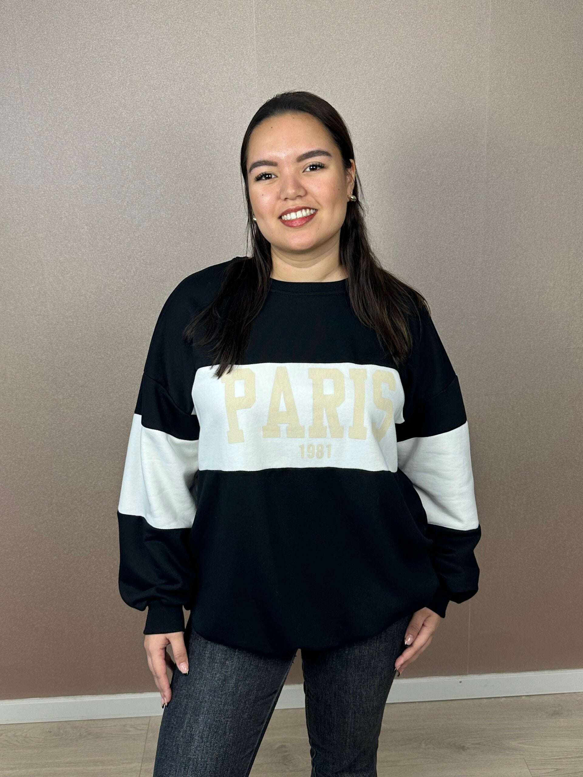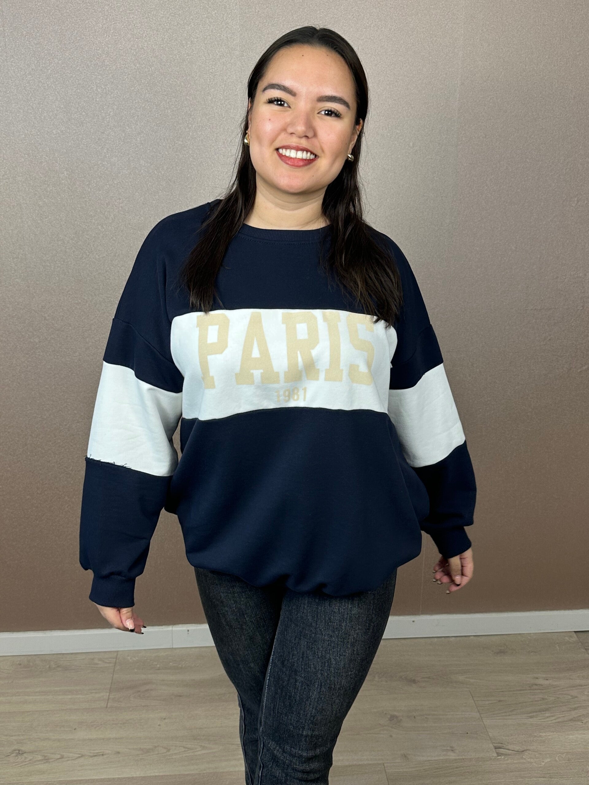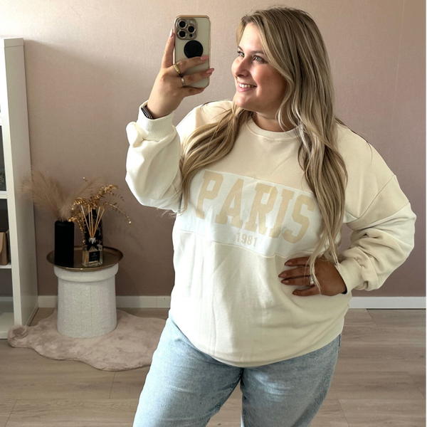 De Dames Sweater Paris is draagbaar van maat 44 t/m 48 en als je hem oversized/ baggy wilt dan is hij van maat 38 t/m maat 42. Verkrijgbaar in drie tijdloze kleuren: Beige, Donkerblauw en Zwart.
