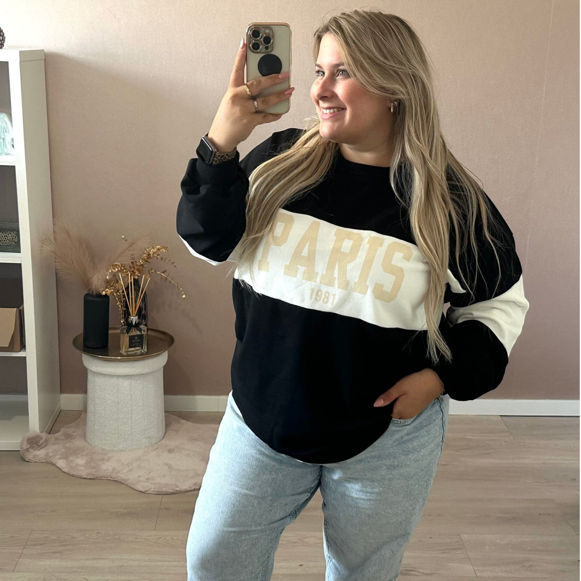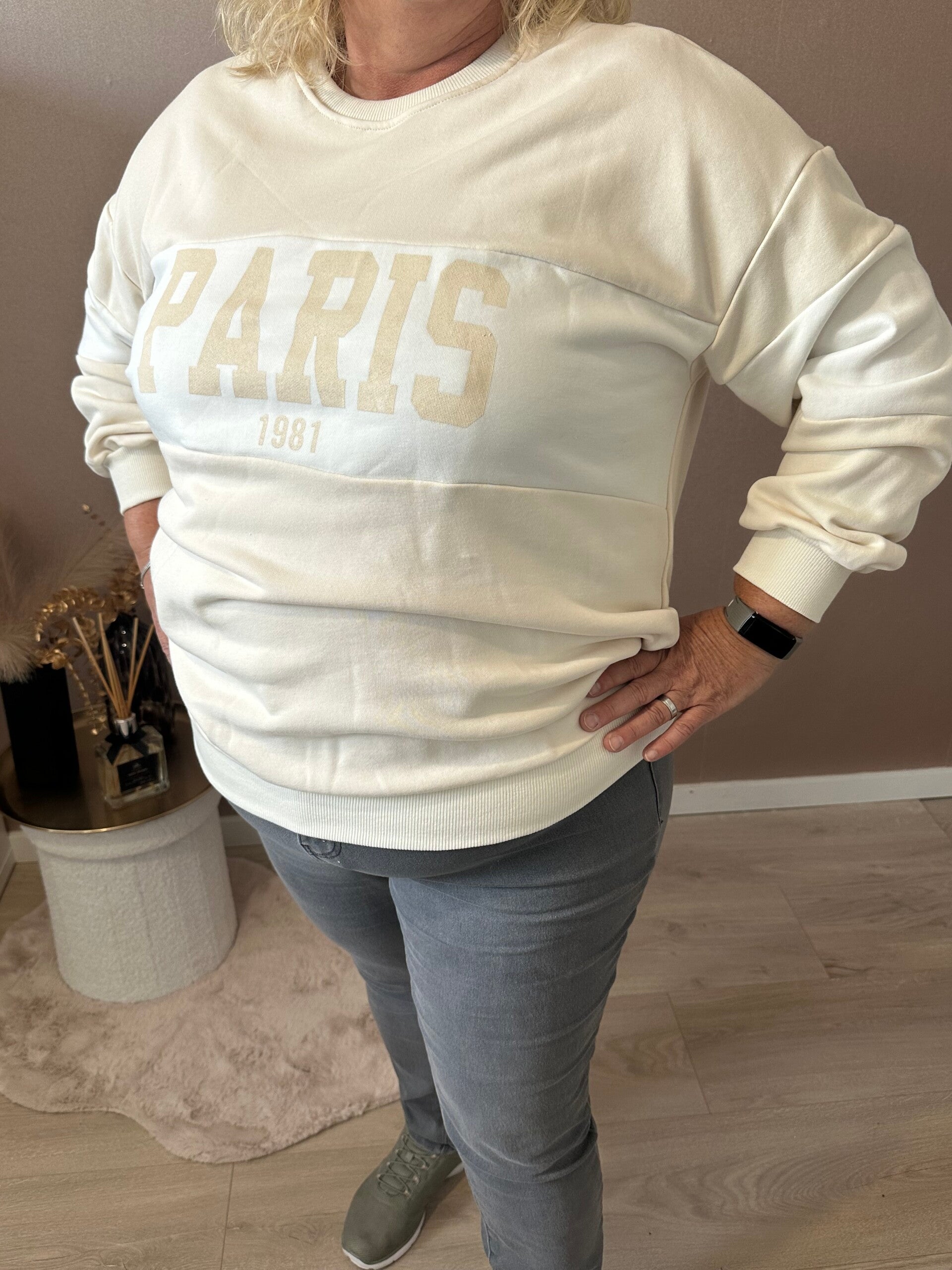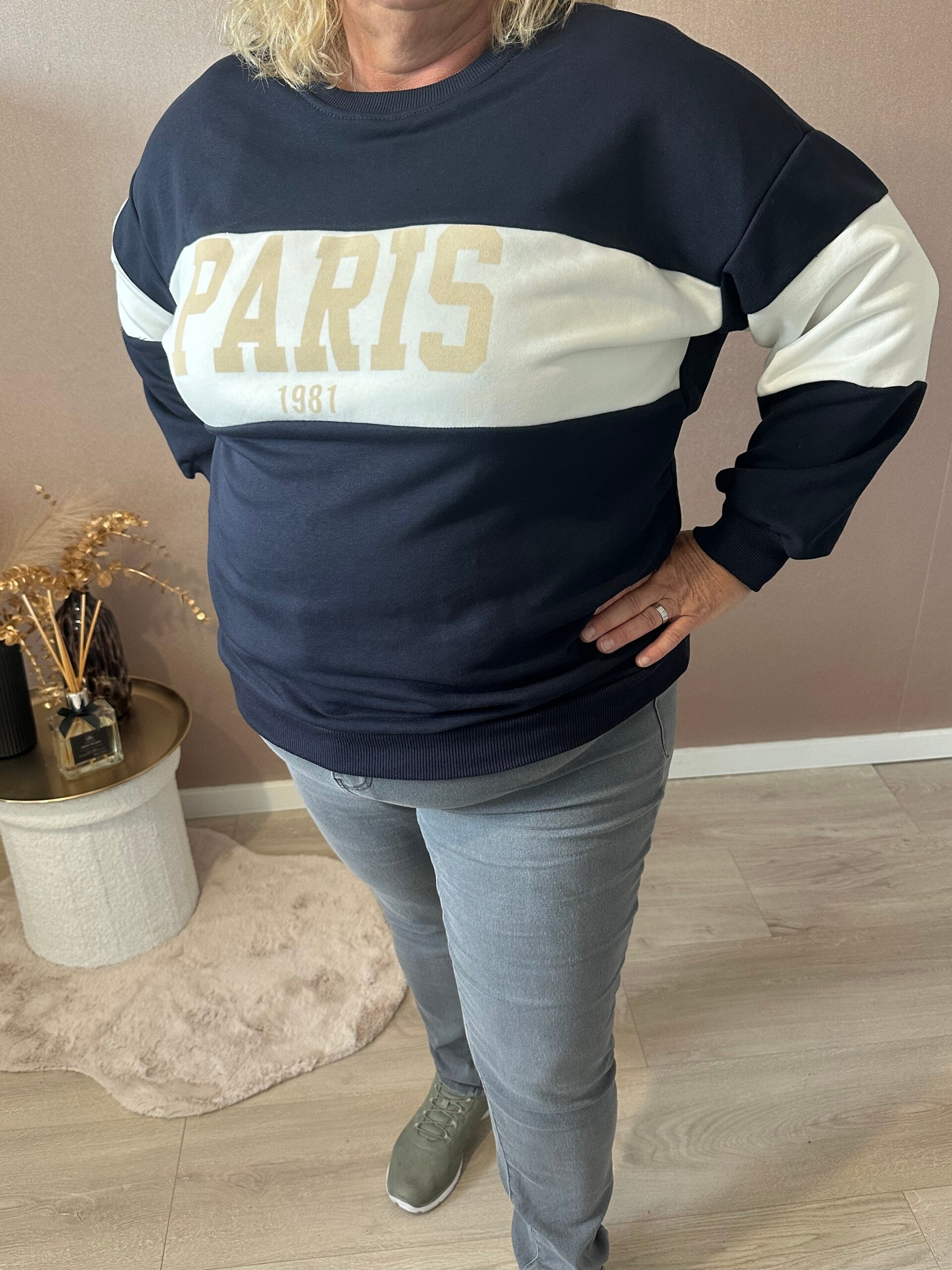 De Dames Sweater Paris is draagbaar van maat 44 t/m 48 en als je hem oversized/ baggy wilt dan is hij van maat 38 t/m maat 42. Verkrijgbaar in drie tijdloze kleuren: Beige, Donkerblauw en Zwart.